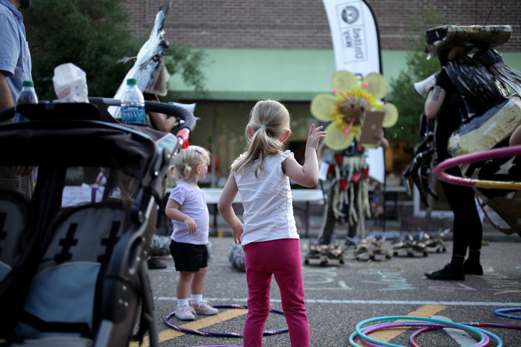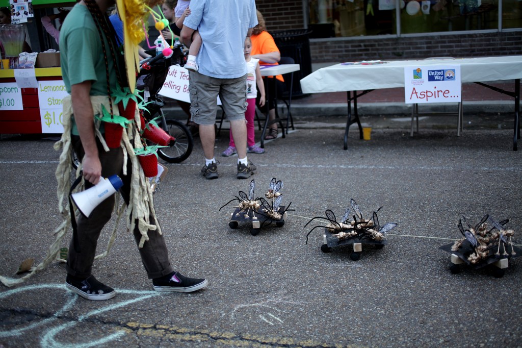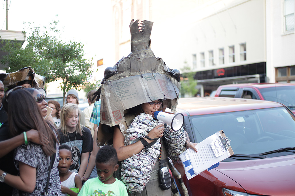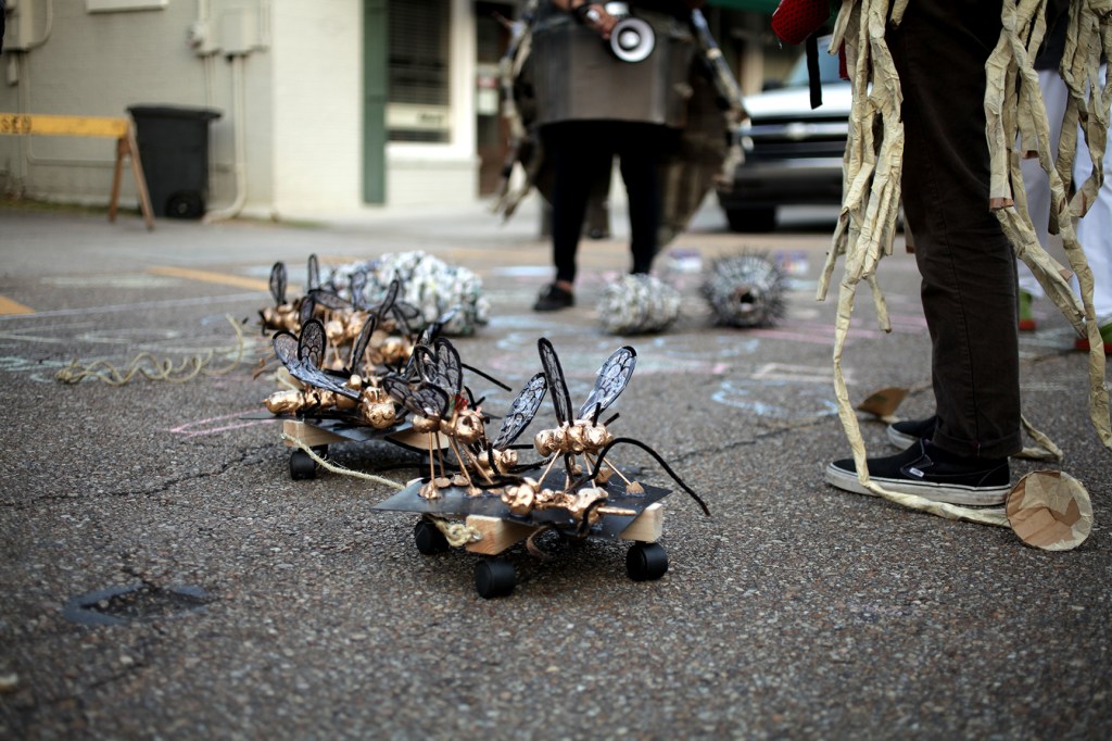 For the Feast of Flowers project I directed several performances. These performances often took place either just in front or fully inside of the installations. The performances drew attention to the project as one created with the collaborative efforts of the entire community, and the performances provided a time and place for the different groups creating different parts of the project to come together. The final two performances included UWF students and Tangipahoa middle schoolers. The final two performances were joined by a parade through downtown Hammond.