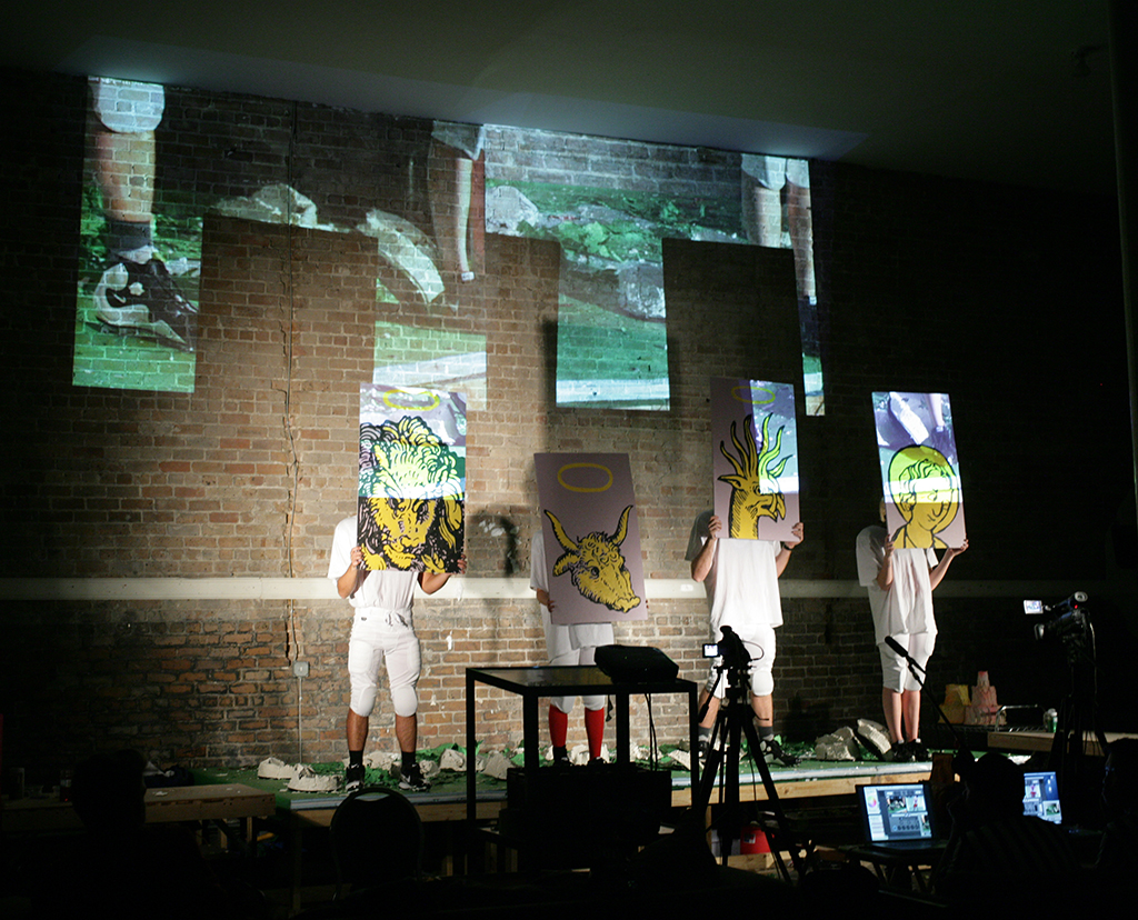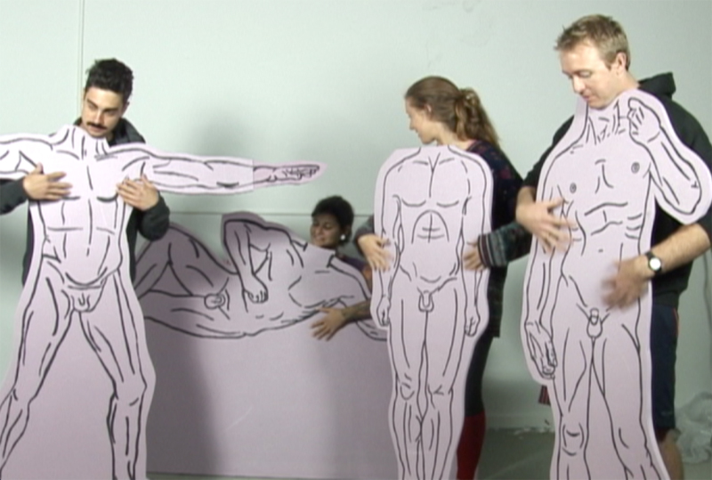 Archetypes are reconfigured as sport-dance or sport-domesticity hybrids are created. Genders are swapped on a frequent basis between performers. Power relations are challenged through the hybridization of form and the reconfiguration of the function of gender in the narrative. Resolution is left to chance. The fusion and fission of cinematic and theatrical forms function alongside the creation and destruction of objects and entities in order to foreground the plasticity of the performed.