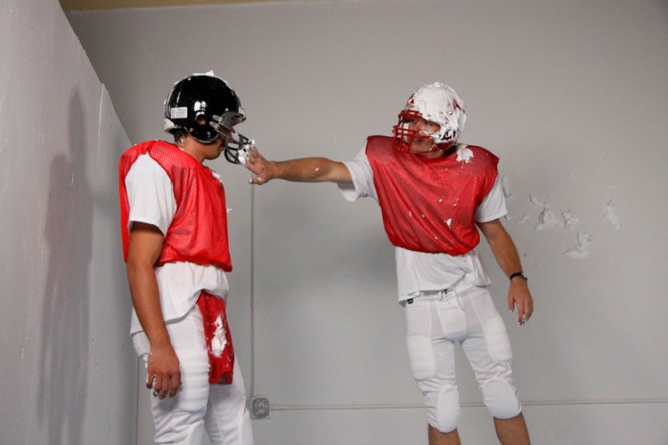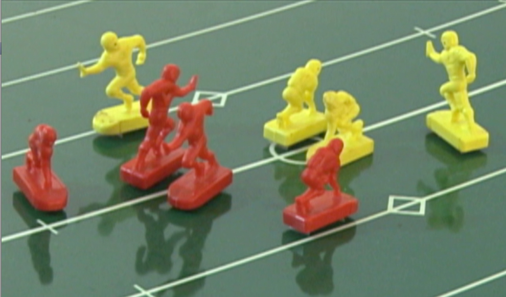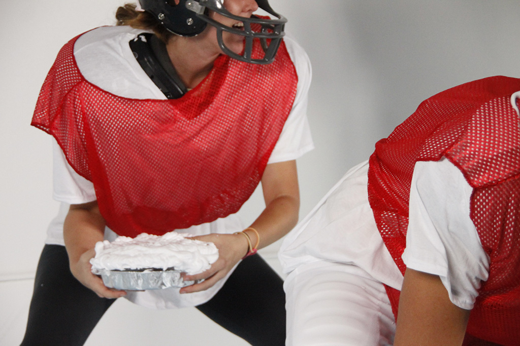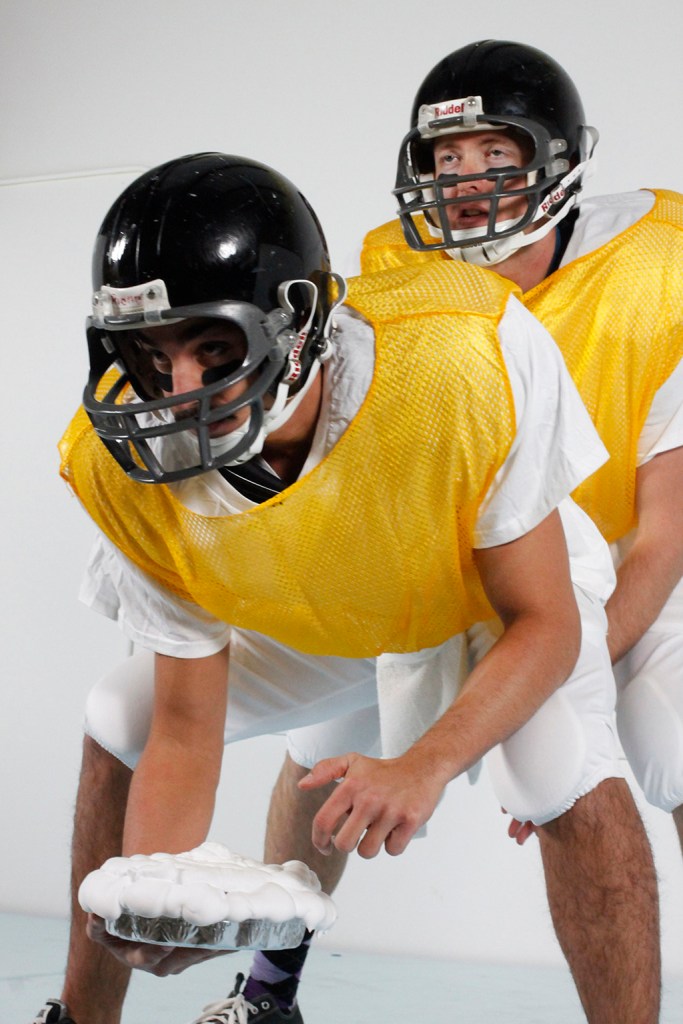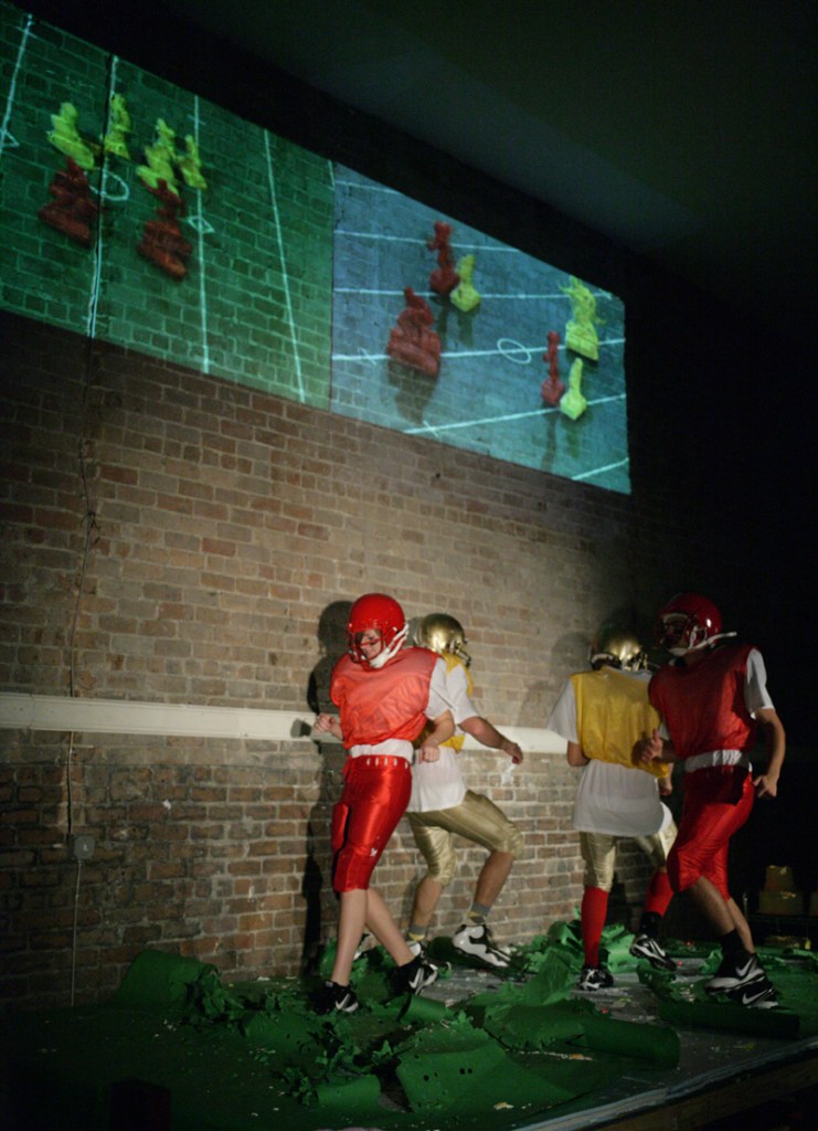 In terms of form, the piece uses two channels of projected video, mixed live, alternating between the live and the pre-recorded image, and projected above a group of live performers, who at times interacting with the projected video. The videos serve to propel a (loose) narrative while the live action is movement based and oft relies on chance and competition. Call and response takes place between the live and the recorded performers, and the pre-recorded video of the coaches and/or the referee directs the participants. Live movements include hybrids of cheerleading moves, square dances, football practice exercises, cake decoration and related forms of vernacular ornamentation, and silent cinema slapstick. Often the movements assume the form of competitive face-offs between teams, combining with traditional dance or video game based action.