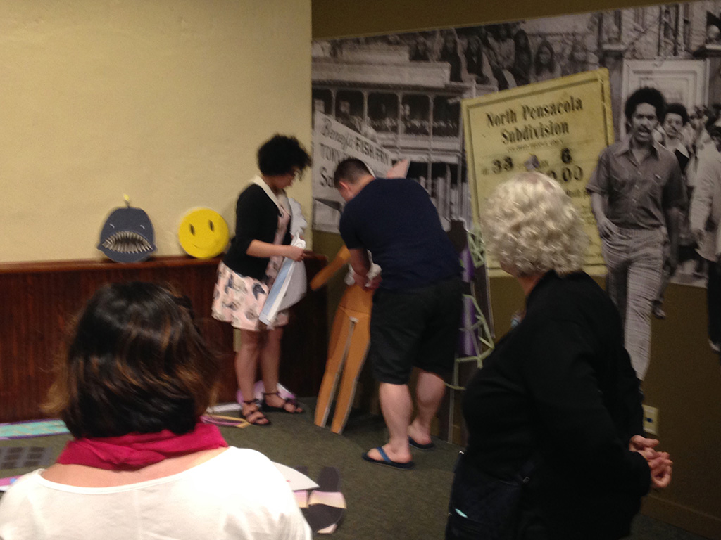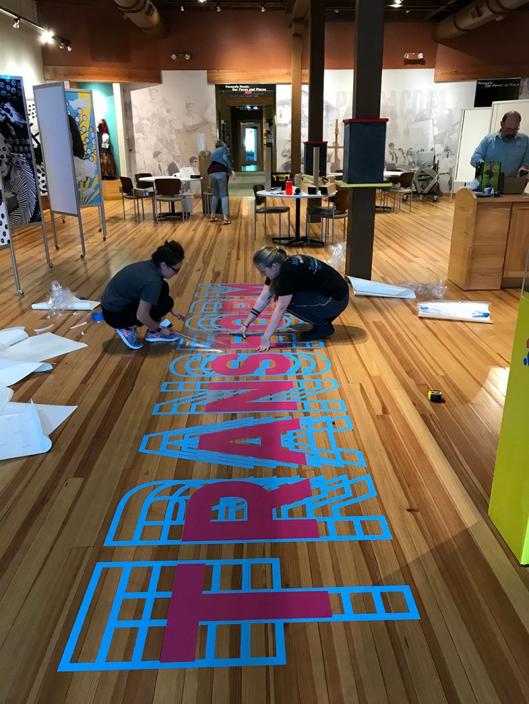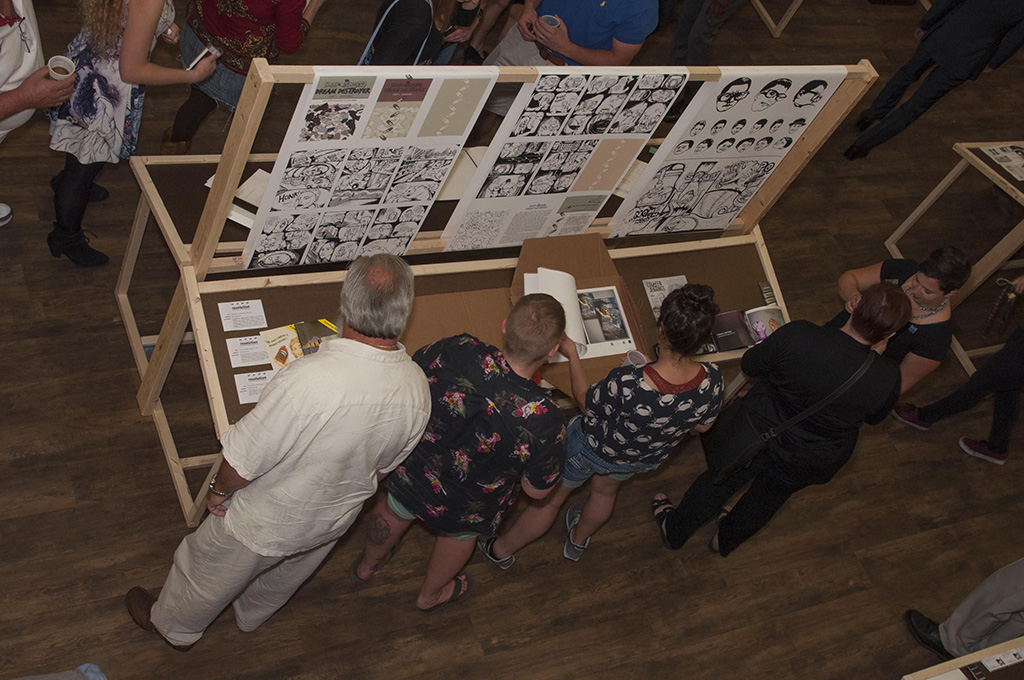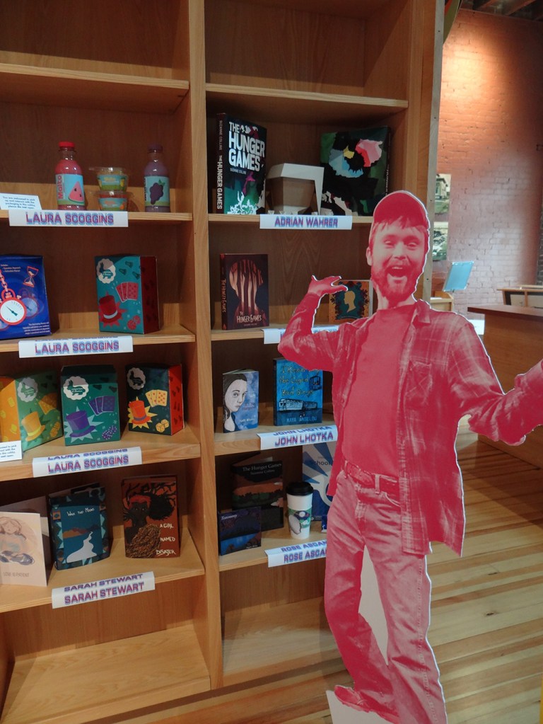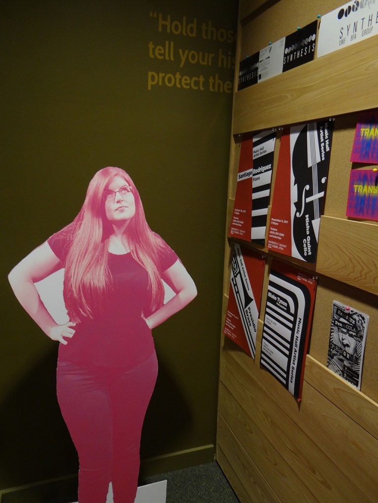 The students designed and built the exhibitions from the ground up. Seniors worked together as a class to create the visual identity for the exhibition. From there forward they chose which components of the exhibition to collaborate on: 1. a style guide for the visual identity and brand 2. Grant proposals including packets for the Office of Undergraduate Research grants and a general funding proposal and presentation that could be presented to various organizations including the Student Government Association 3. An advertising campaign that utilizes both print and social media 4. A website that functions like an online catalog 5. A print catalog 6. The environmental design of the exhibition that includes not only wayfinding and the creation of a unified environmental visual identity, but also the design of the individual genre-based sections or rooms in the multi-roomed exhibition. Examples below…