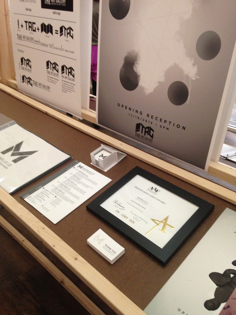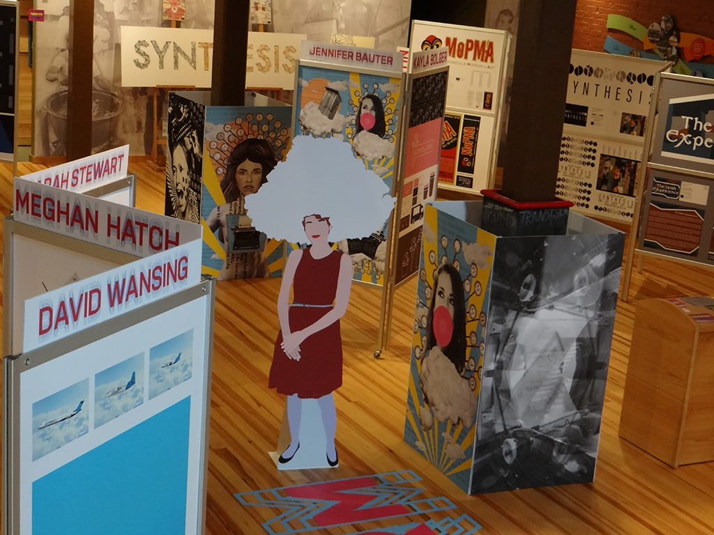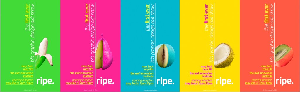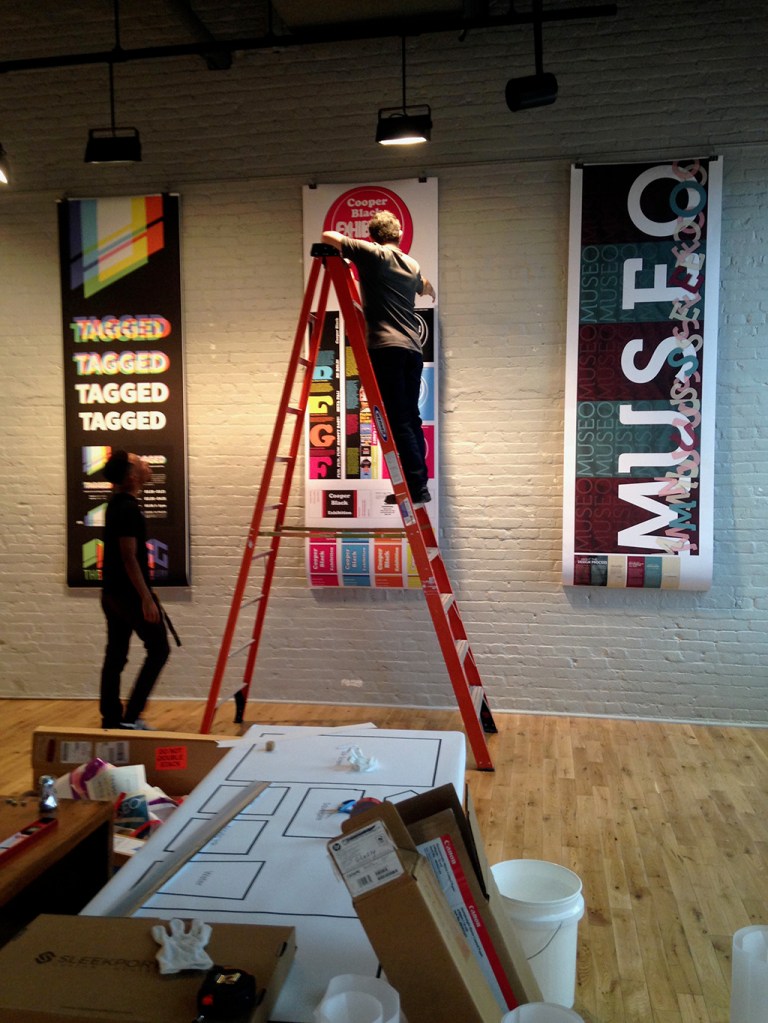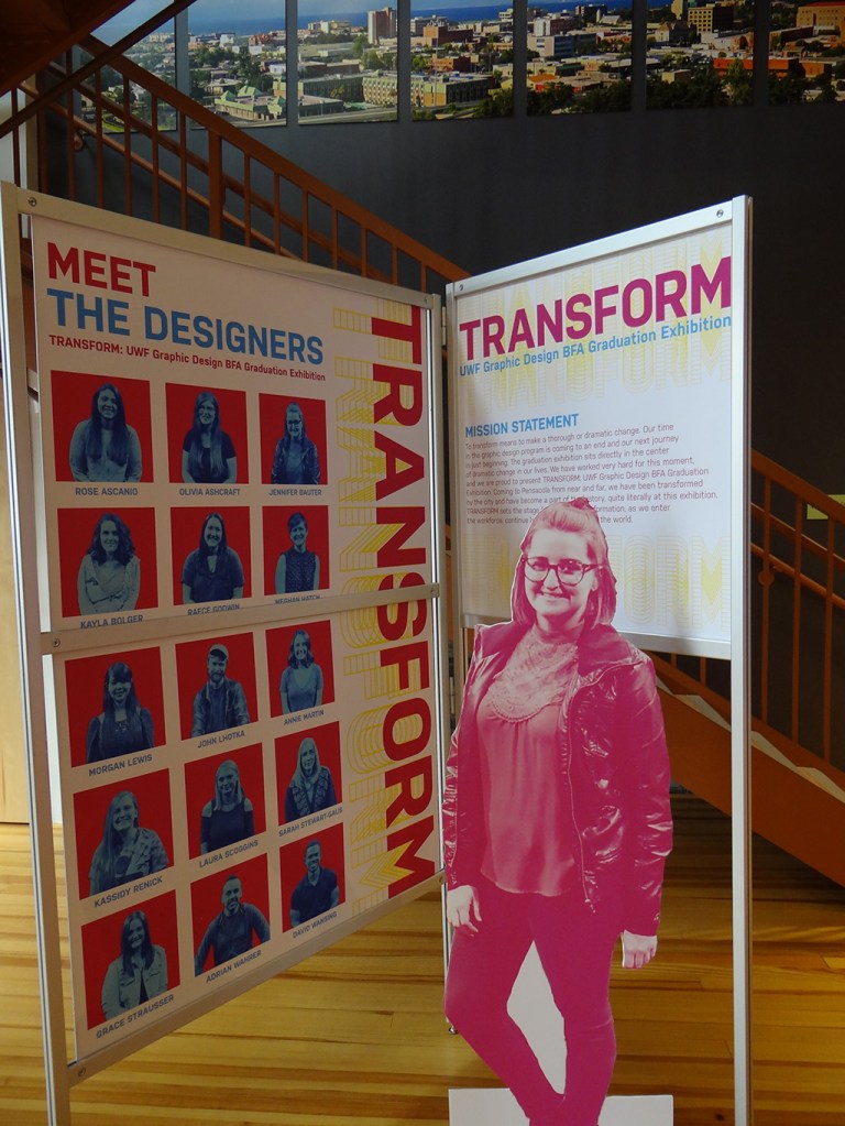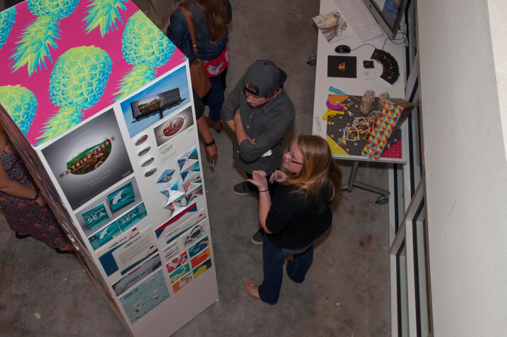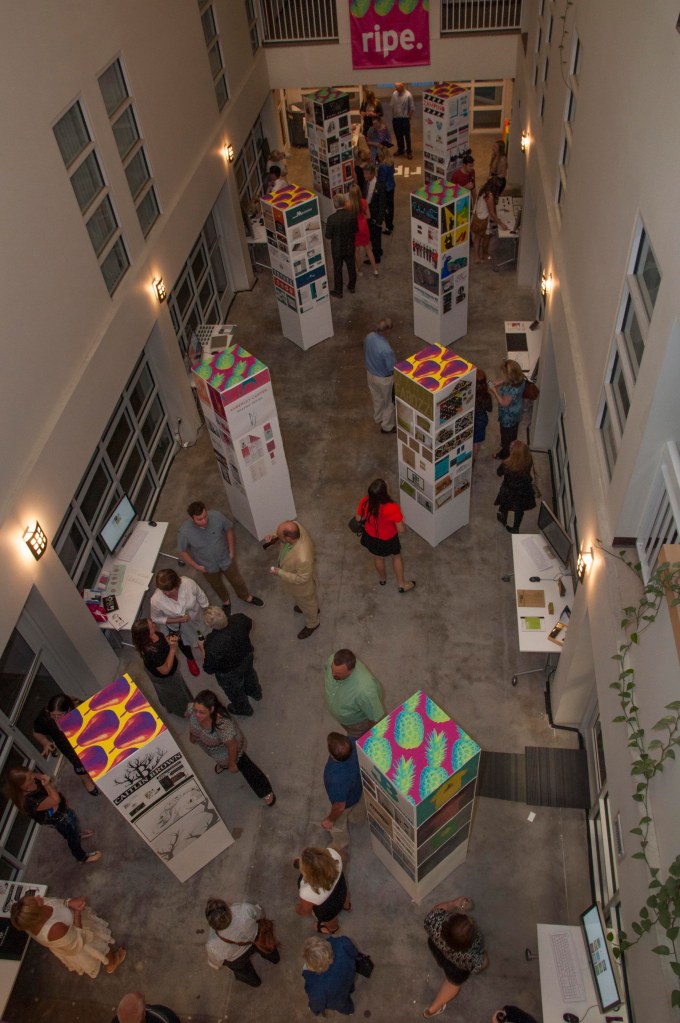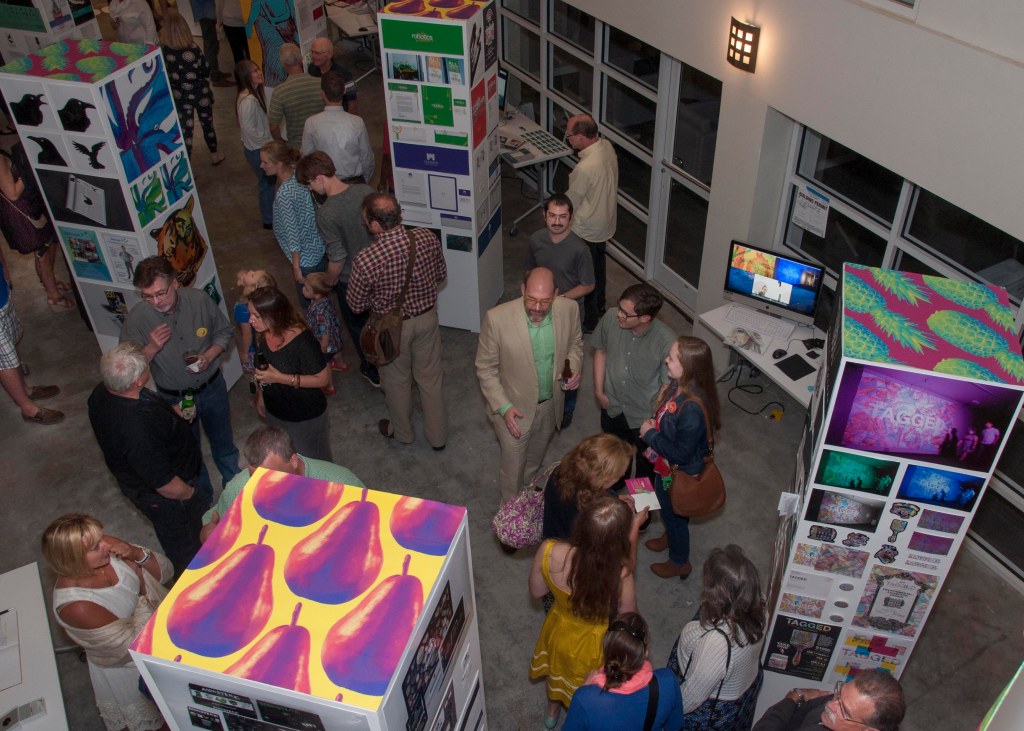 Beginning with the first graduating class of BFA Graphic Designers, my students participated in a year long capstone in order to collaborate to produce a public exhibition of their design work. The students worked together to fully design the exhibition of their work. They created an exhibition graphic identity and fully composed an exhibition environment in a downtown venue including designing and building the bases to support the display of the work. In addition to that they produced advertising campaigns in order to market the show in both print and on social media, they created printed marketing collateral and peripherals, and designed a printed catalog of their work. Exhibition statements can be viewed on the catalog page here…