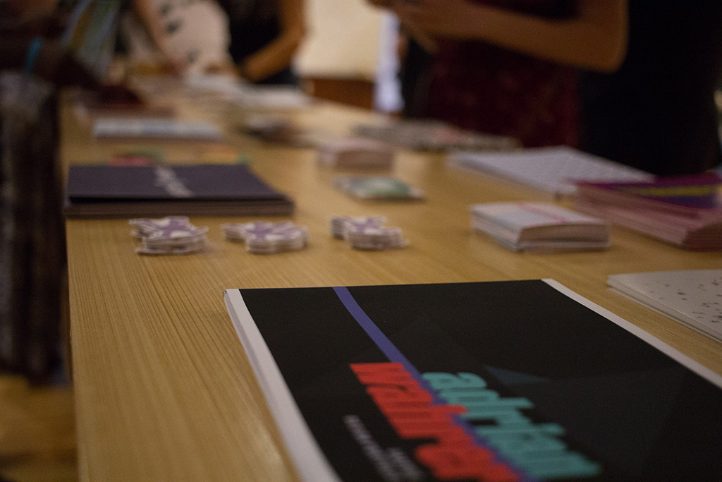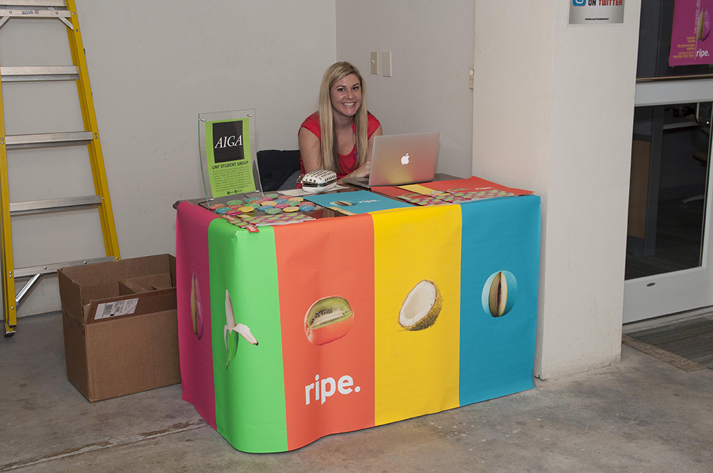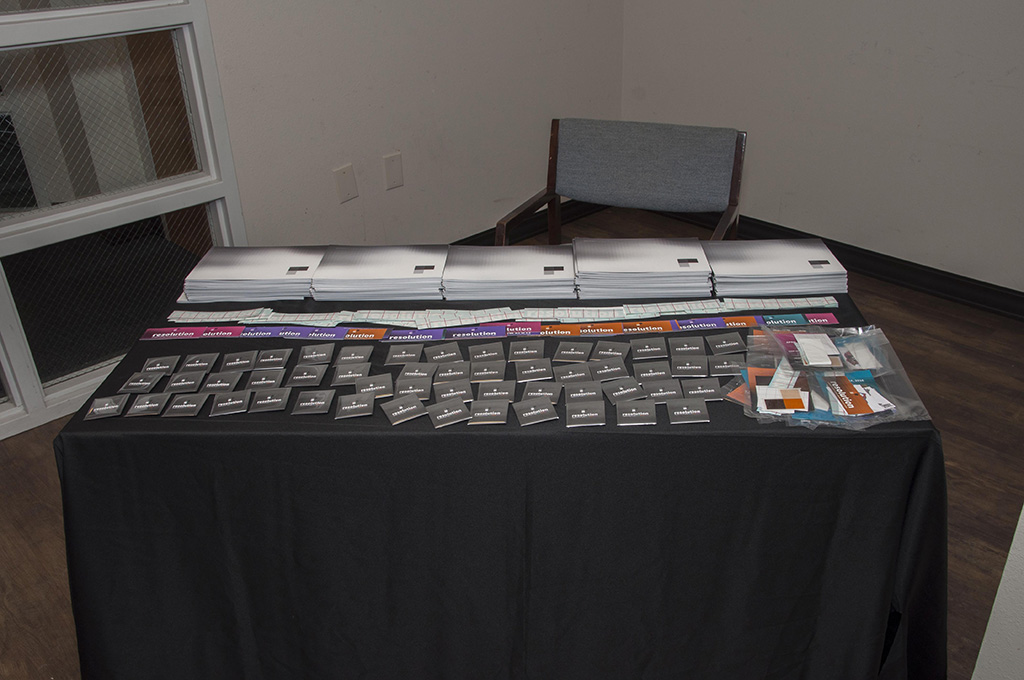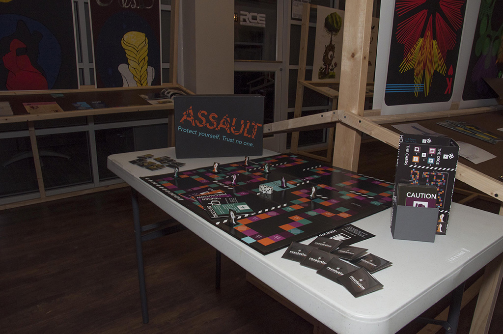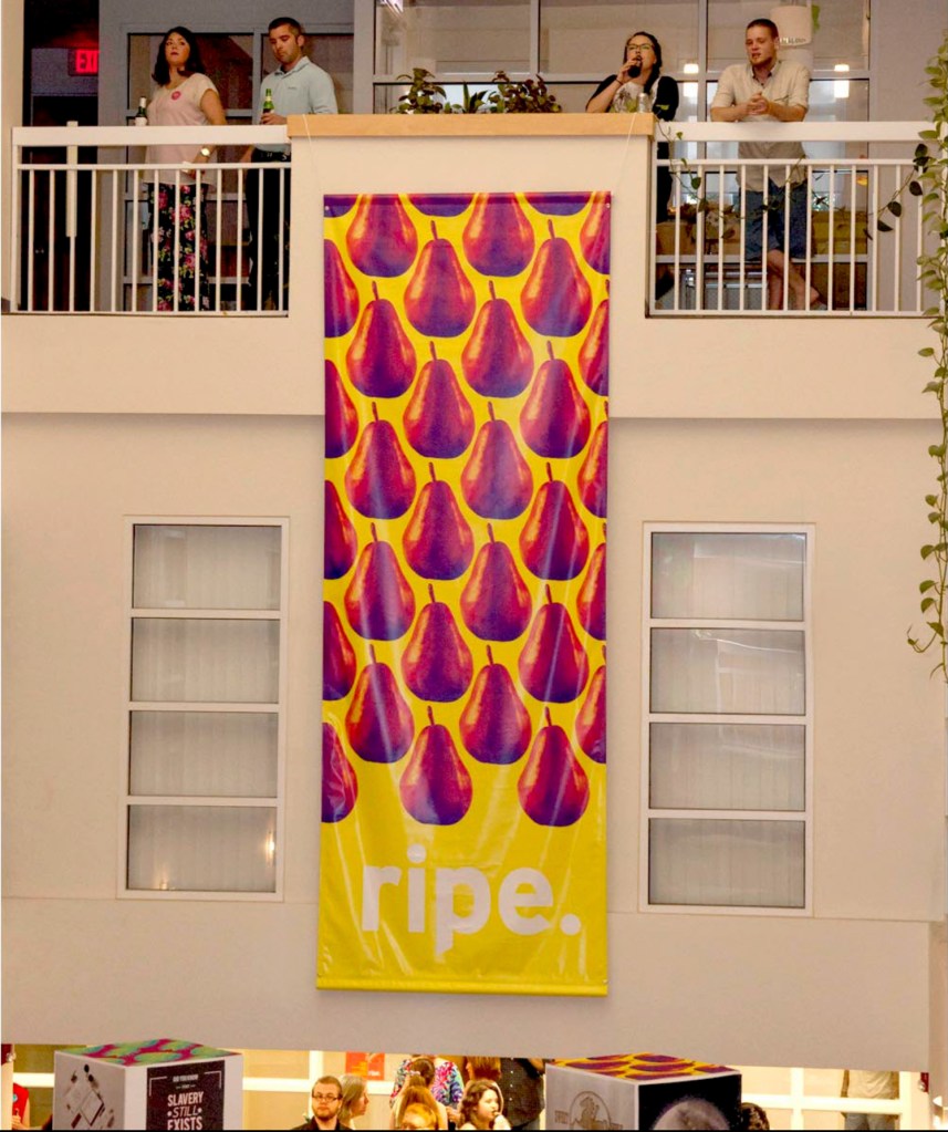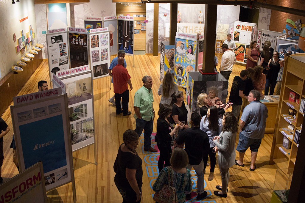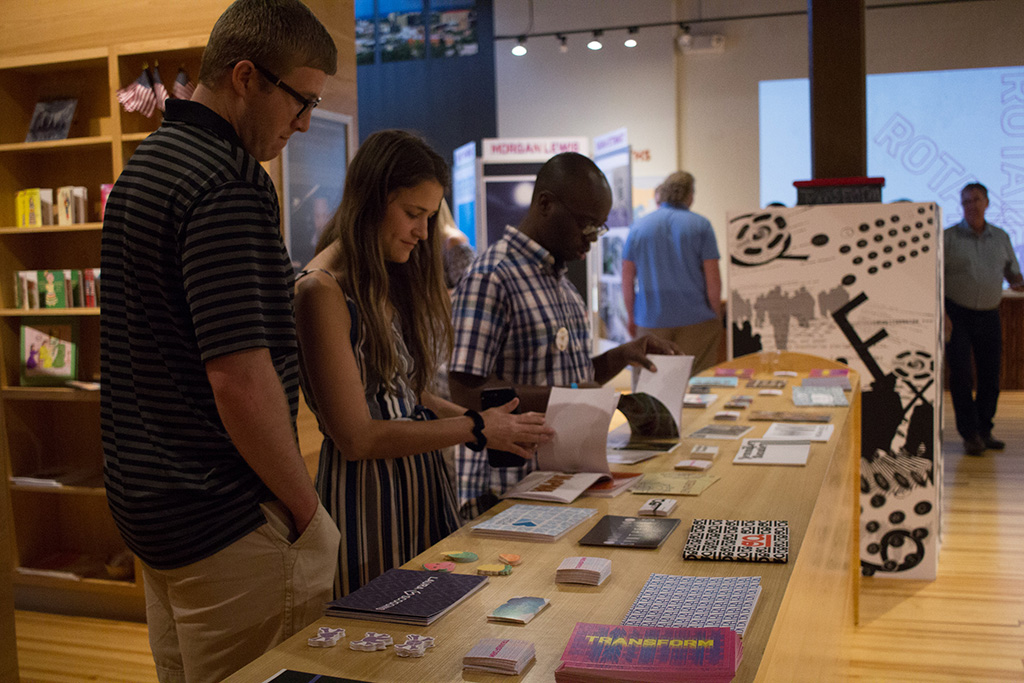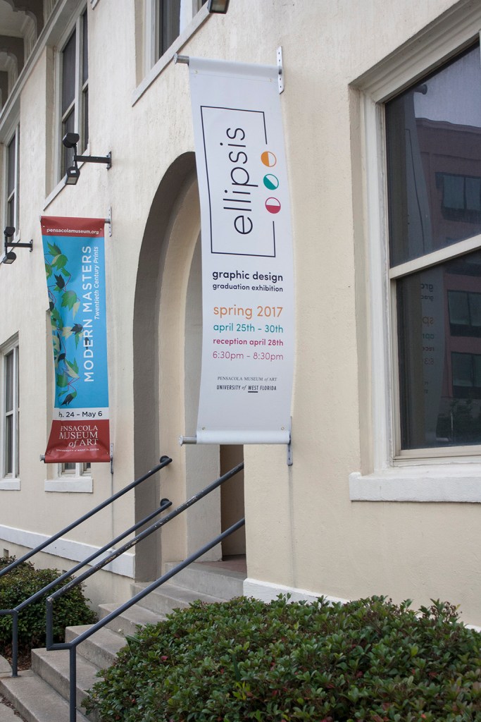 Beginning with the first graduating class of BFA Graphic Designers, my students participated in a year long capstone in order to collaborate to produce a public exhibition of their design work. The students worked together to fully design the exhibition of their work. They created an exhibition graphic identity and fully composed an exhibition environment in a downtown venue including designing and building the bases to support the display of the work. In addition to that they produced advertising campaigns in order to market the show in both print and on social media, they created printed marketing collateral and peripherals, and designed a printed catalog of their work. Exhibition statements can be viewed on the catalog page here…